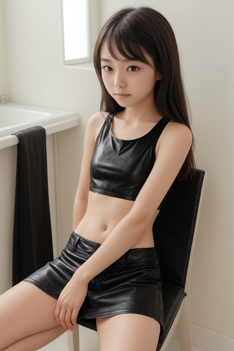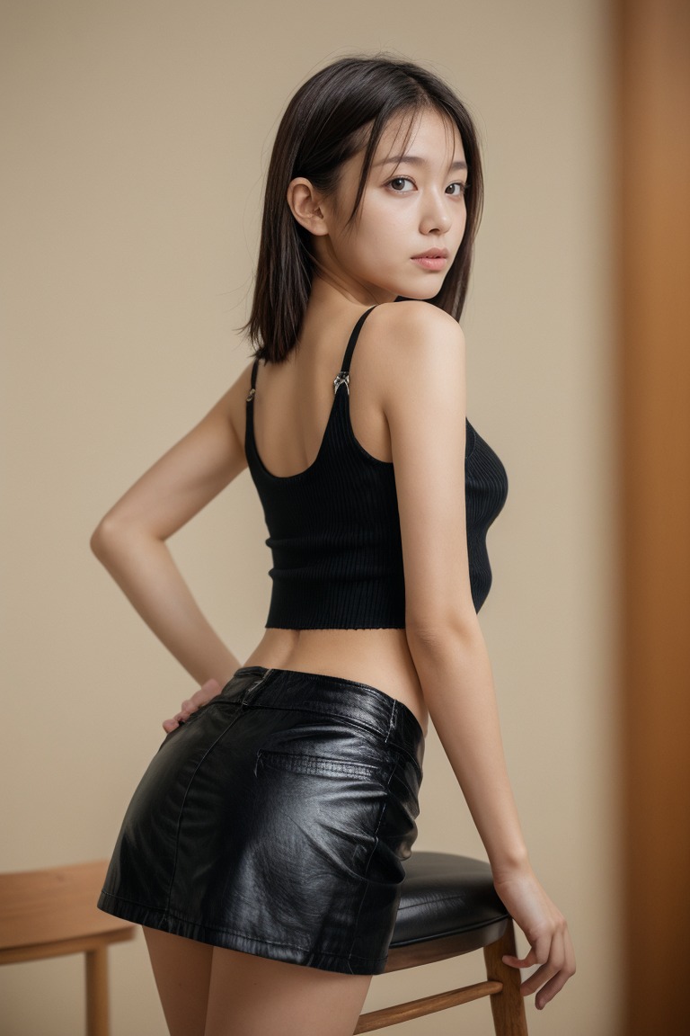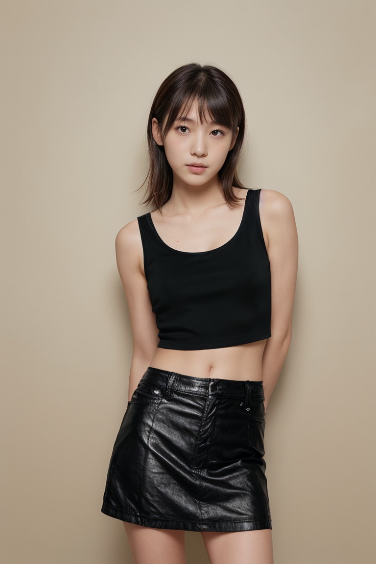 トリガーワード <lora:jyouge06_v1:1>jyouge (black leather:1.1), ( (black leather flat short tanktop:1.2), black leather skirt ) , (navel out:1.2)